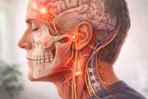 A forward head position places additional demand on the muscles that support the skull and jaw. Over time, this can increase tension in the jaw joint and surrounding tissues.