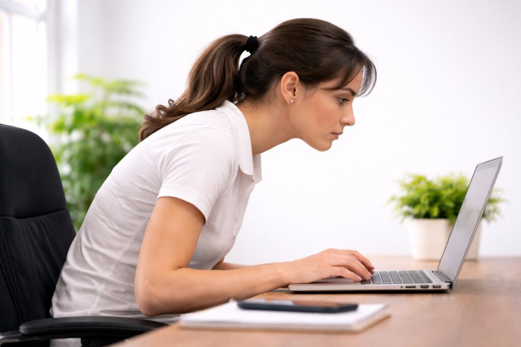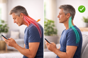Over time, your body adapts to whatever position you spend the most time in. Sitting at a desk, looking down at your phone, driving, and leaning forward all reinforce the same pattern.