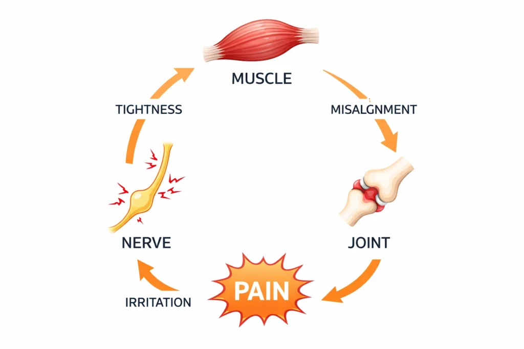 Imbalanced muscles begin to pull joints out of proper alignment. Spinal joints lose normal motion and position. This affects the nerves that control those same muscles. The muscles then function even less efficiently, and the pattern continues to reinforce itself.